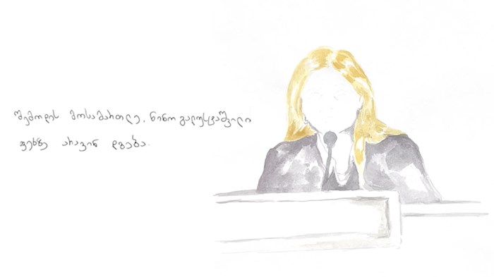 „გთხოვთ, ადგეთ!“ - მანდატური. შემოდის მოსამართლე ნინო გალუსტაშვილი. ფეხზე არავინ დგება.