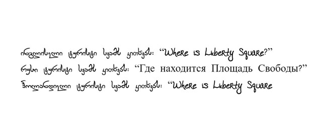 ინგლისელი ტურისტი სვამს კითხვას: “Where is Liberty Square?” რუსი ტურისტი სვამს კითხვას: “Где находится Площадь Свободы?” ჰოლანდიელი ტურისტი სვამს კითხვას: “Where is Liberty Square?”