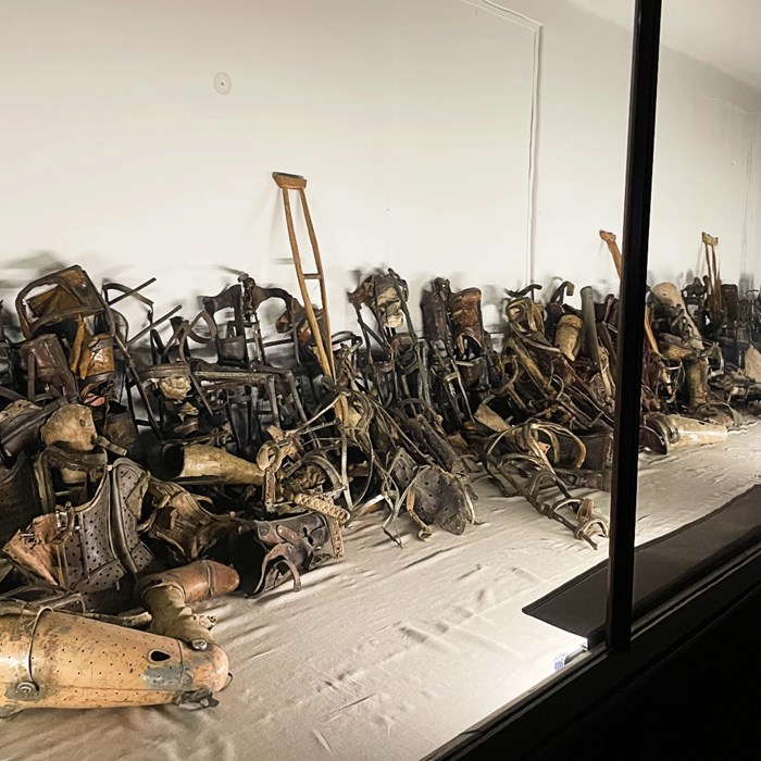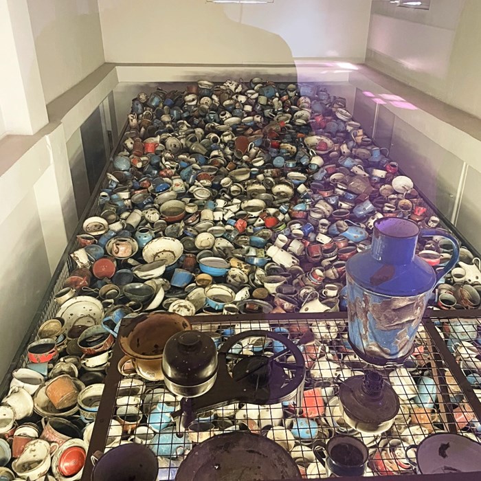 მეორე სახლის შუშის ვიტრინებში საყოფაცხოვრებო ნივთებია. აქ დროისგან დაჭმუჭნული ტყავის გროვაა - ფეხსაცმელების გორაკები. წითელ, მაღალქუსლიან ფეხსაცმელს ვხედავ, ყავისფერ გროვაში კოხტად რომ გდია. იქვე, ოქროსფერი და ღია ცისფერი ძაფებით მოქარგული ერთი ცალი ქოშია. გვერდზე ოთახში აურაცხელი რაოდენობის ჭურჭელია: ქვაბები, ჯამები, ტაფები, ჩაიდნები. ეუბნებოდნენ, რომ საცხოვრებლად ჩამოჰყავდათ, კარტოფილის სათლელებიც კი მოჰქონდათ. სხვა ოთახებში ჩემოდნებია, თითქმის ყველა ერთნაირი - მართკუთხედი, ყავისფერი ტყავის, რომლებსაც ზედ თეთრი საღებავით გვარები აწერია. ამ ვეებერთელა ოთახის მთელი კედლის სიგრძეზე კი 2 ტონამდე თმების, ნაწნავების ვიტრინაა. გვამების თმებისგან ნაჭერს აკეთებდნენ, მწვანე, უხეშ ქსოვილს, რომელიც იქვე, საჩვენებლადაა დადებული.