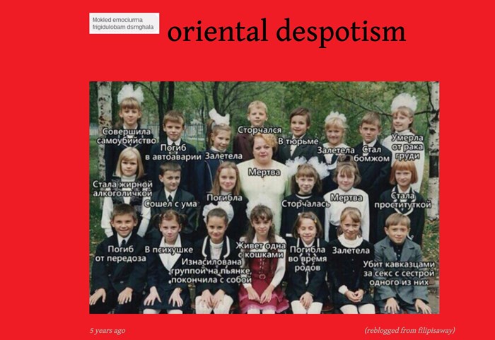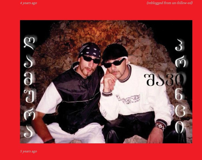 თუ დაფიქრდები, არაფერია უფრო აღმოსავლეთი, ვიდრე ჰენრიკ მხითარიანის გოლი დონეცკის შახტარის მაისურით; პატარძალი ქართულ ქორწილში, რომელიც ჰაერში აცლის იარაღის მჭიდს; ანდაც სოფო ბედია - ორიგინალი კიმ კარდაშიანი. ეს პროექტი ბევრი წლის წინათ გავაკეთე უნივერსიტეტისთვის, სადაც ციფრულ კულტურას ვსწავლობდი და ვიკვლევდი პოსტსაბჭოთა სივრცისთვის დამახასიათებელ თვითნაკეთ ესთეტიკას ინტერნეტში. ფოტოებს რამდენიმე თვის განმავლობაში ვაგროვებდი ნიუსებიდან, ფეისბუკიდან, თამბლერიდან და ყველა ციფრული კომუნიდან, სადაც პოსტავდა აღმოსავლეთის ხალხი. ყველა ფოტო მოპარულია, რა თქმა უნდა.