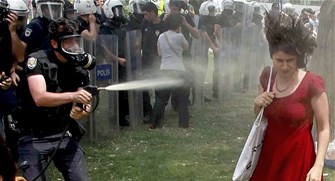 აქციის დაშლა წიწაკის სპრეითა და წყლის ჭავლით სტამბოლში.