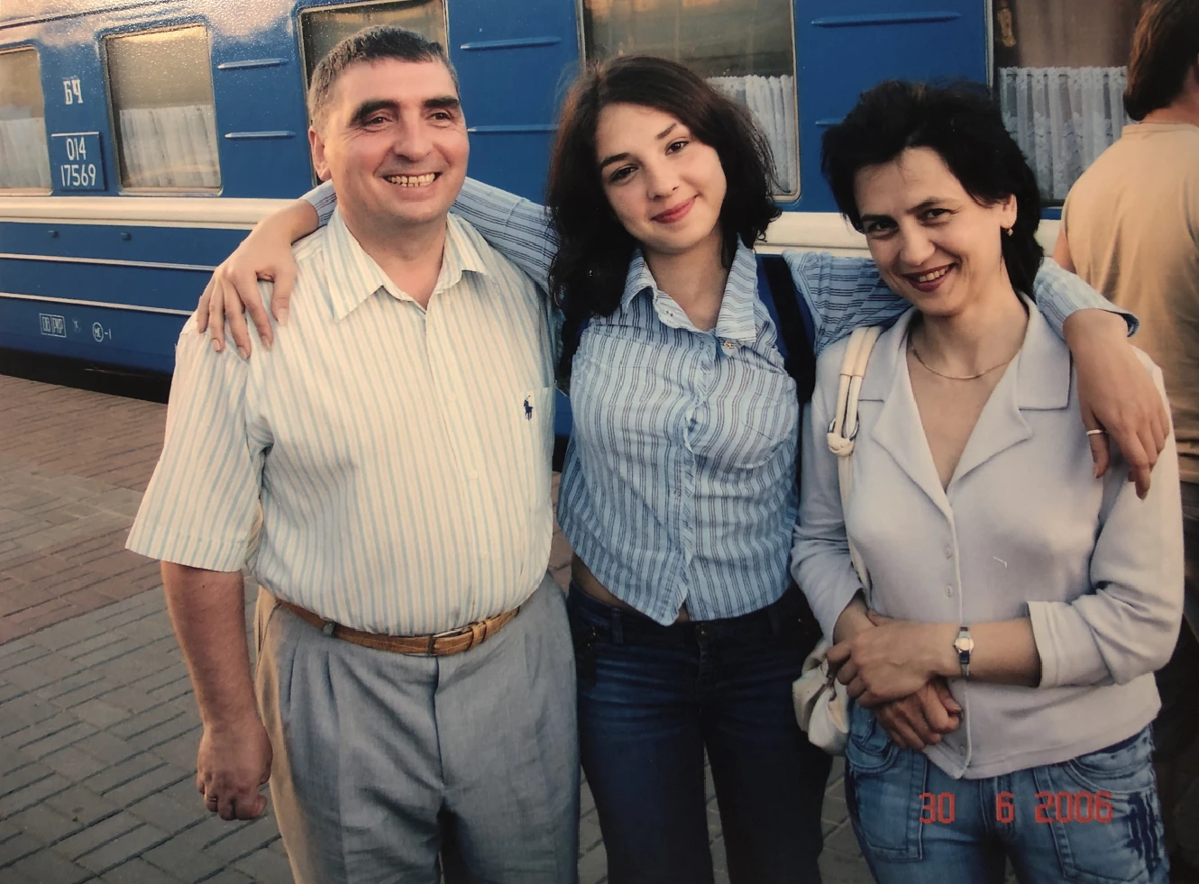 Mara Tamkovich with her parents at the station before leaving for Poland. July 1, 2006.