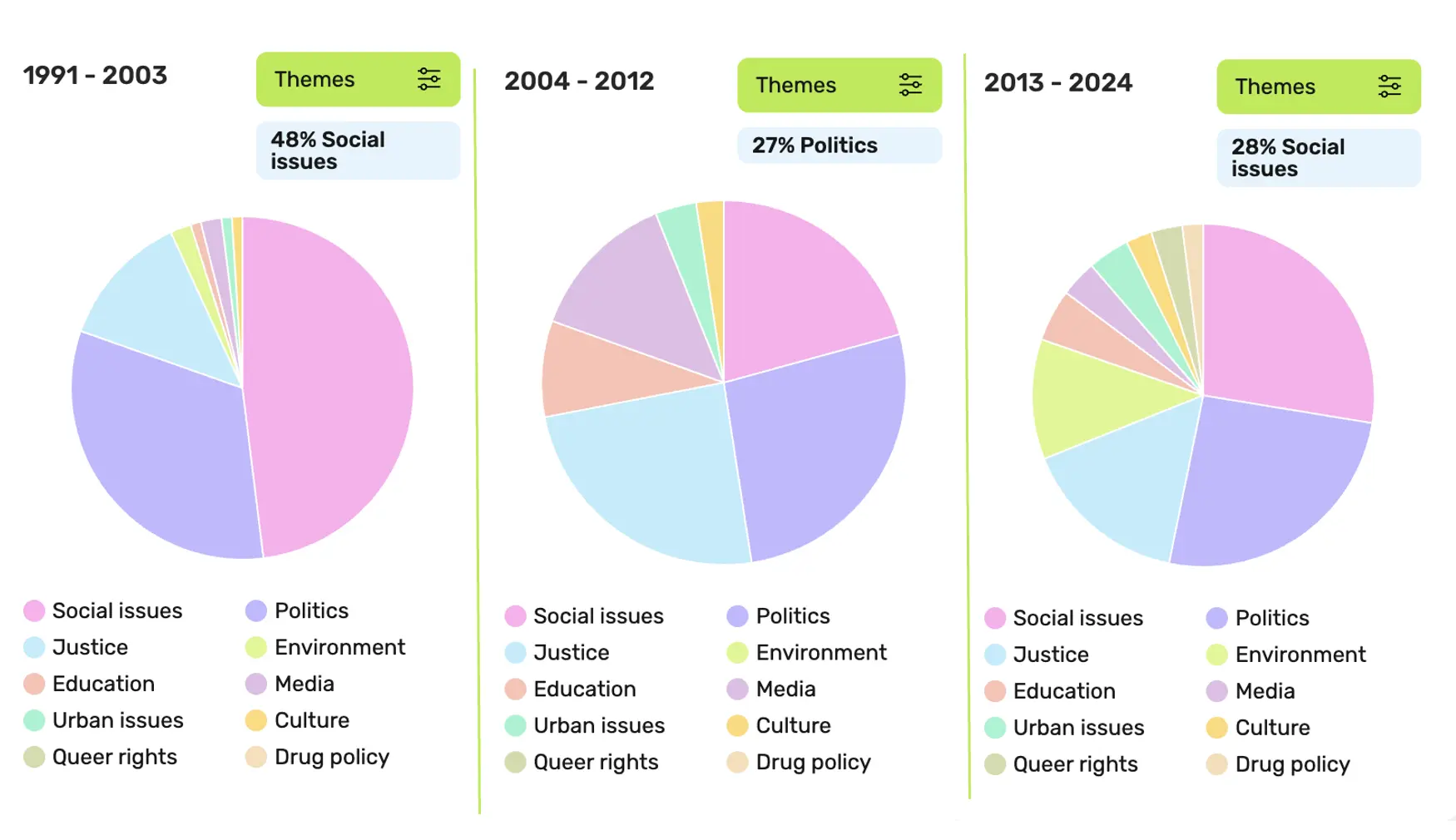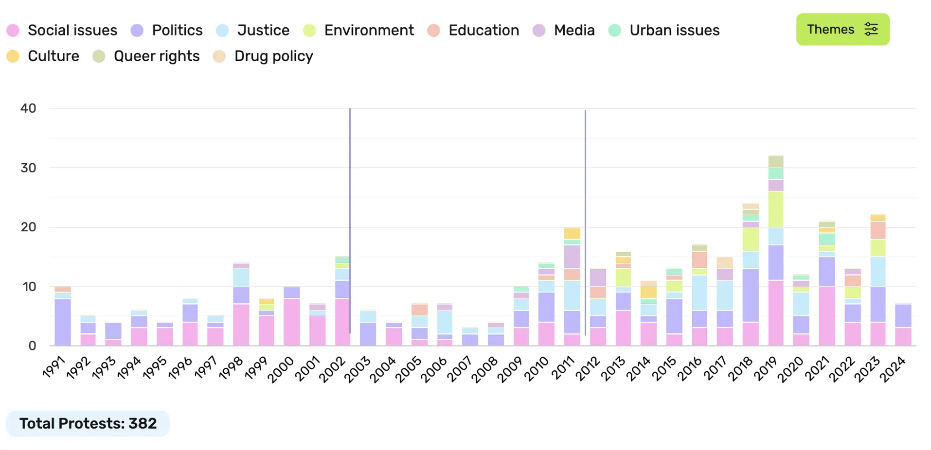 Protest themes (2013 onward): Themes diversified, with social issues still leading (28%), followed by political issues (25%) and justice /human rights (16%). Environmental issues gained visibility (11%).