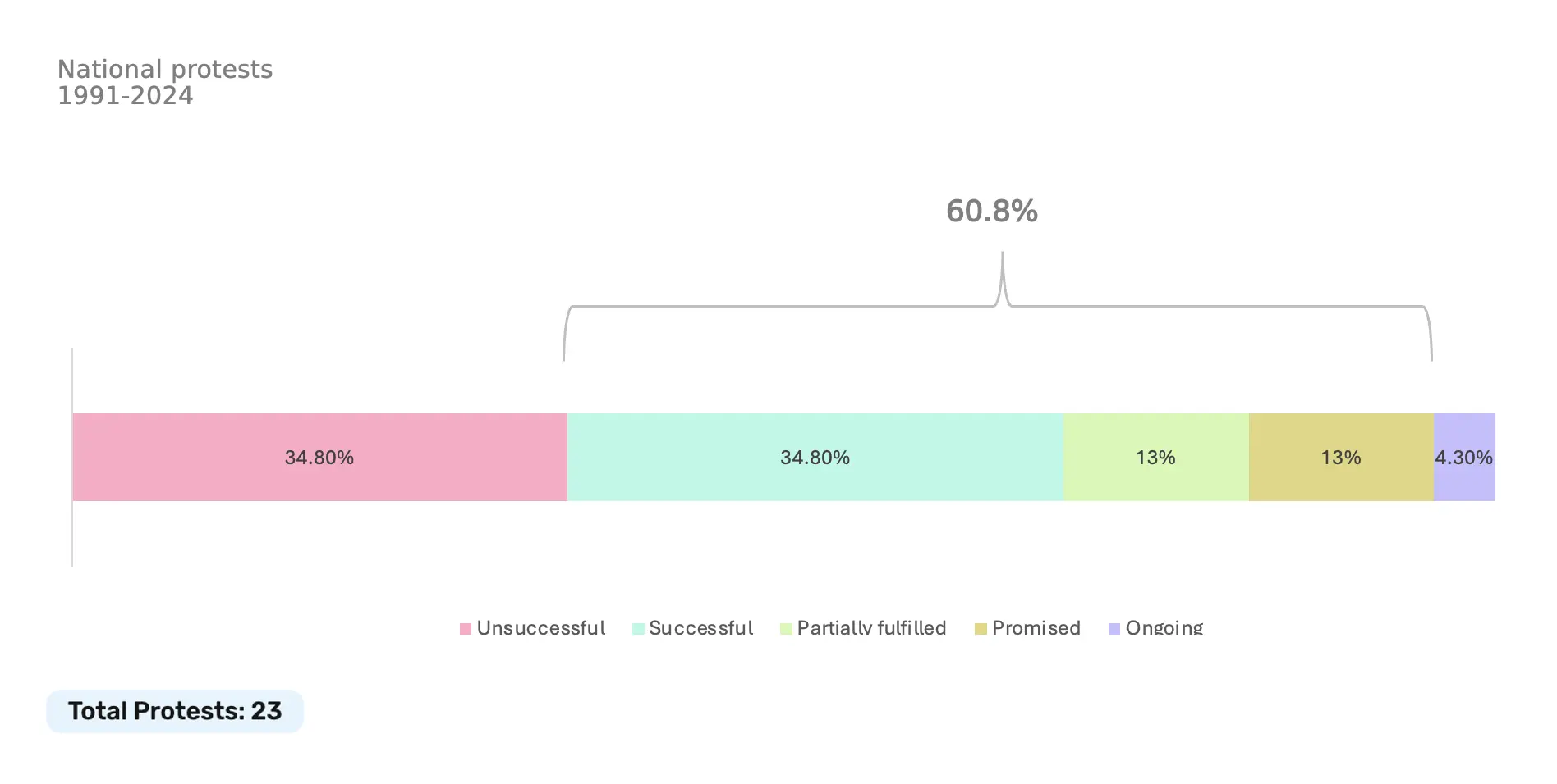 From 1991 to 2024, 52% of protests were unsuccessful (none of the demands met). The rest ended with full or partial satisfaction of demands or after authorities made promises to act.