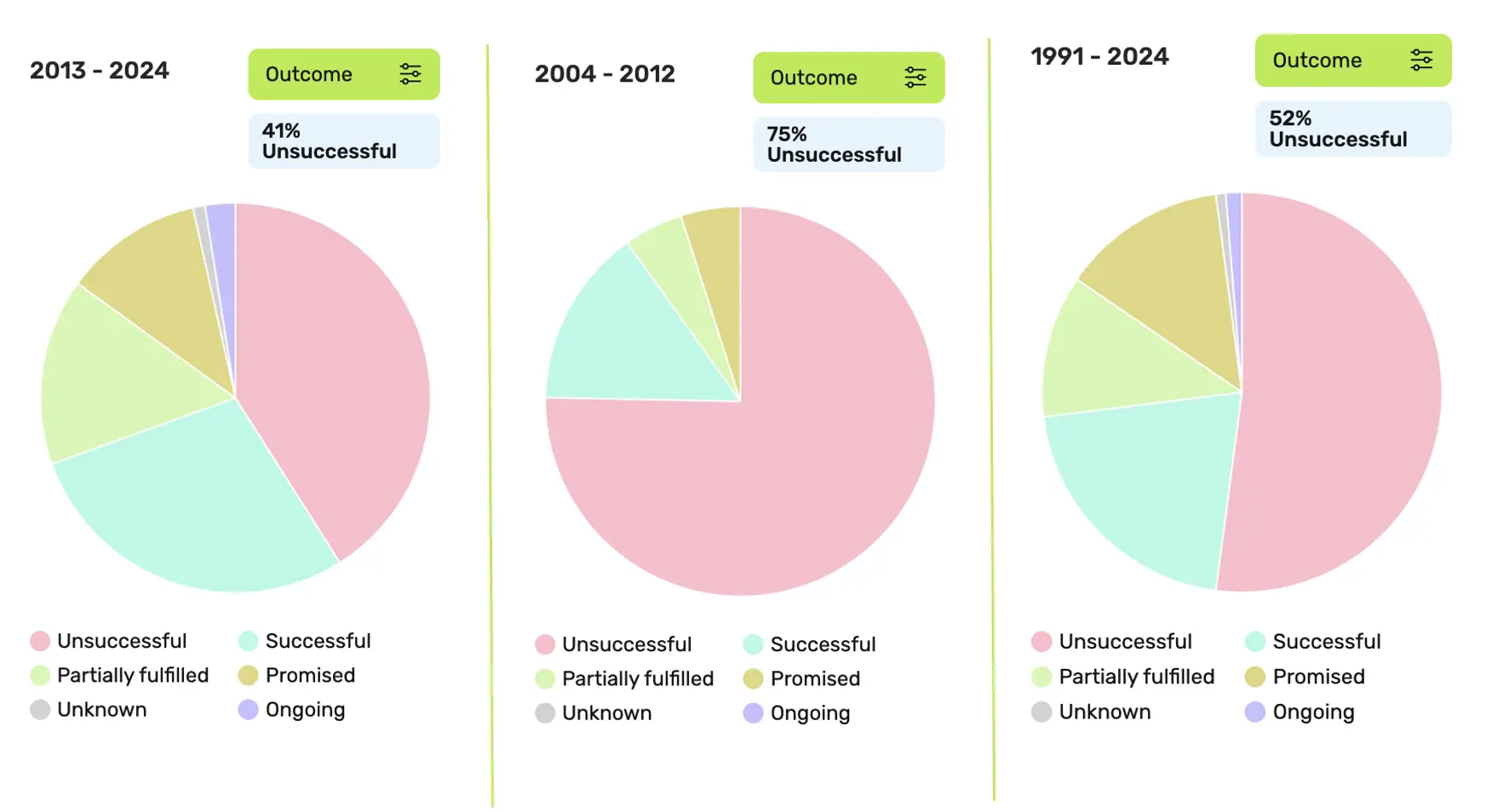 2004–2012: The majority (71%) of protests ended with no demands met.